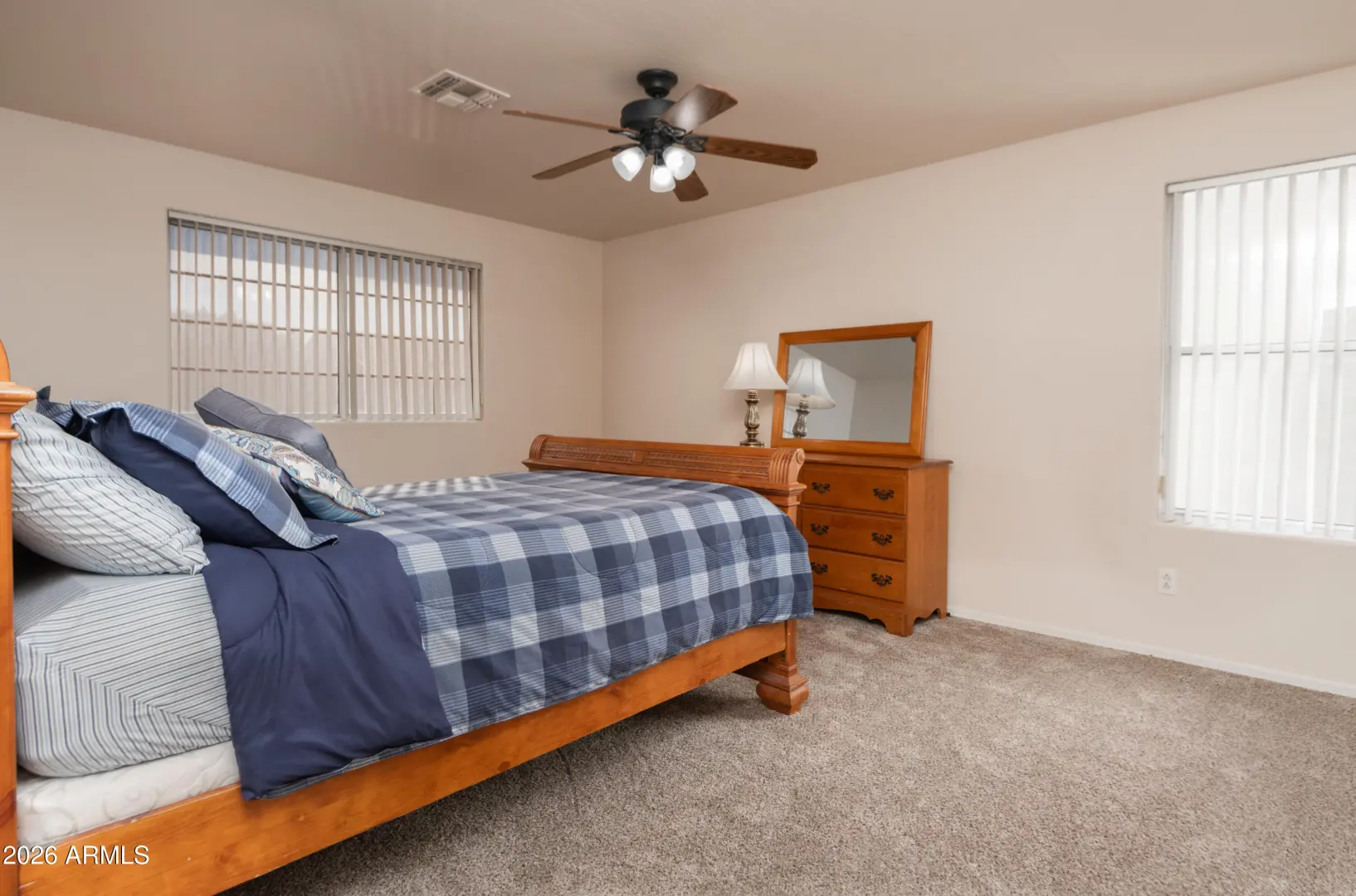 Welcome to a hidden oasis in Marshall Ranch, where comfort, scale, and serenity come together on one of the neighborhood's most desirable lots. Set on a quiet cul-de-sac and backing directly to the canal, this exceptional 4,010-square-foot residence offers rare privacy, peaceful surroundings, and easy access to the walking, running, and biking path just beyond the backyard. With 5 bedrooms and 3.5 baths, the home is thoughtfully designed to accommodate a variety of living situations. Two spacious primary-sized suites, each with its own ensuite bath -- one upstairs and one downstairs -- provide flexibility for multigenerational living, guests, or anyone who simply values abundant space and comfort. Every bedroom is generously sized, easily accommodating a king-sized bed,
