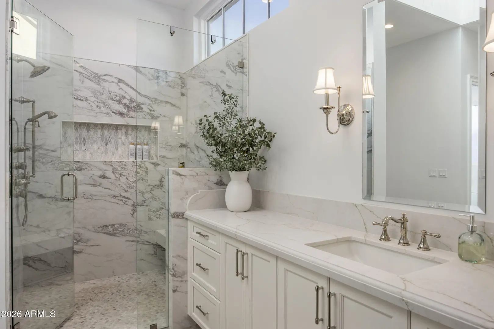 Experience refined luxury in this custom estate within Gilbert's gated Landmark at Somerset. 4,731 sq ft of light-filled living showcases expansive Windsor sliding glass walls, rich hardwood floors, and a chef's kitchen featuring a Wolf range, dual refrigerator/freezer, farmhouse sink, and butler's pantry. The thoughtful split floor plan offers 4 bedrooms and 4.5 baths, with a luxurious primary suite retreat featuring a soaking tub and separate shower. Designed for effortless entertaining, the home opens to more than 1,500 sq ft of covered outdoor living with travertine patios, outdoor kitchen, resort-style pool, and firepit. Includes a separate family room and optional exercise room for additional living. A private auto court and four-car garage complete this exceptional offering.