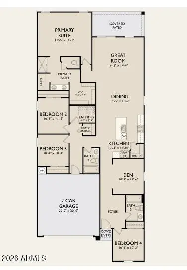 Welcome to the Poppy floorplan at Alba in Amarillo Creek, Maricopa. This farmhouse-style home offers 2,071 sq ft with 4 bedrooms, 3 bathrooms, a den, and a 2-car garage on a premium lot. The open-concept kitchen, dining, and great room connect to a covered patio with sliding glass door. A front bedroom with nearby bath is ideal for guests. The spacious primary suite features dual sinks, walk-in shower with glass, water closet, linen storage, and walk-in closet. Finishes include the Oxford Collection, wood-look tile flooring, white quartz countertops, espresso cabinets, stainless steel GE gas appliances with fridge, washer and dryer, faux wood blinds, soft water loop, and garage door opener--move-in ready.