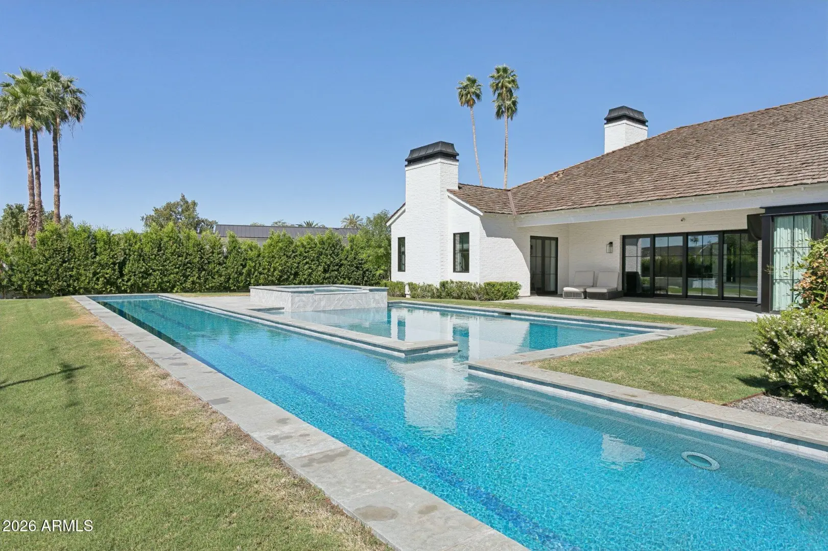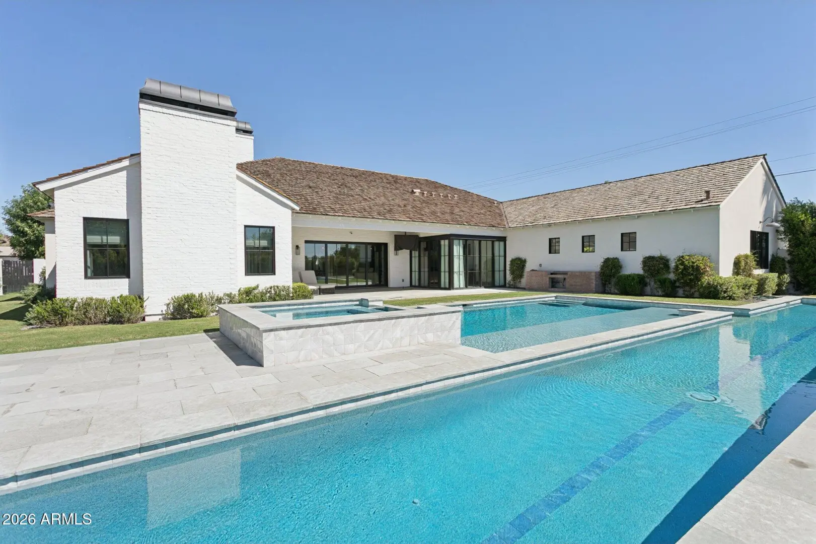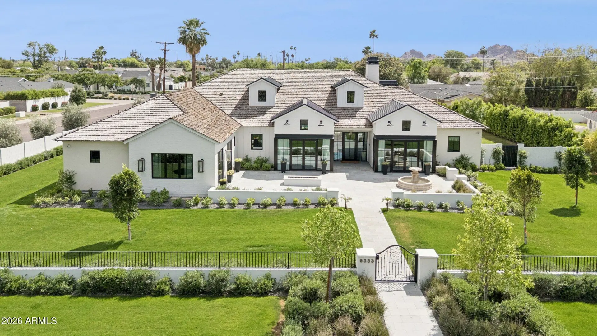 Completed in 2024 by McIntyre Development, nothing quite says Arcadia Living like this custom French-inspired farmhouse, where curb appeal meets refined interior design. A cedar-shake roof, crisp white masonry, and black steel windows frame an expansive front lawn and elevated patio—perfect for morning coffee and golden-hour gatherings. Inside, designed by Jamie Rose, you will find vaulted ceilings with exposed beams, statement lighting, hardwood flooring, and rich stone, which add to the warmth and charm. A gallery hallway—with arched openings and checkerboard stone—creates a striking procession to the primary suite, secondary bedrooms, game room, and office. The split plan offers a serene primary retreat with a large stone fireplace and a breathtaking primary bath showcasing a